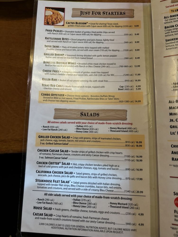 Start your meal with the unforgettable Cactus Blossom, a Texas-sized, golden-fried onion served with zesty Cajun sauce. If you’re a fan of bold flavors, the Boneless Buffalo Wings and Rattlesnake Bites are must-tries.